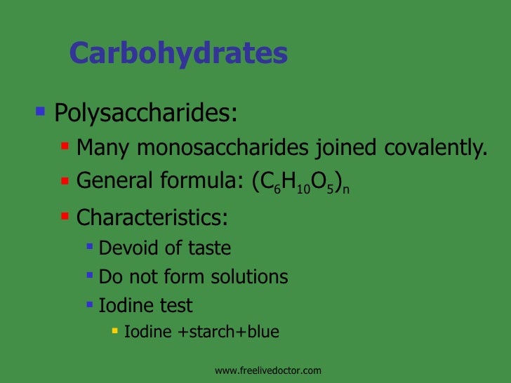 - 66. Carbohydrates Polysaccharides: Many monosaccharides joined covalently. General formula: (C 6 H 10 O 5 ) n Characteristics: Devoid of taste Do not form solutions Iodine test Iodine +starch+blue www.freelivedoctor.com
