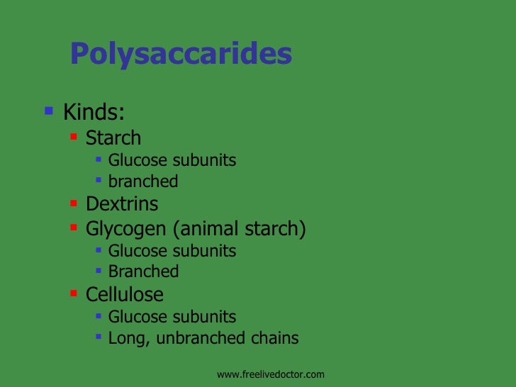- 67. Polysaccarides Kinds: Starch Glucose subunits branched Dextrins Glycogen (animal starch) Glucose subunits Branched Cellulose Glucose subunits Long, unbranched chains www.freelivedoctor.com