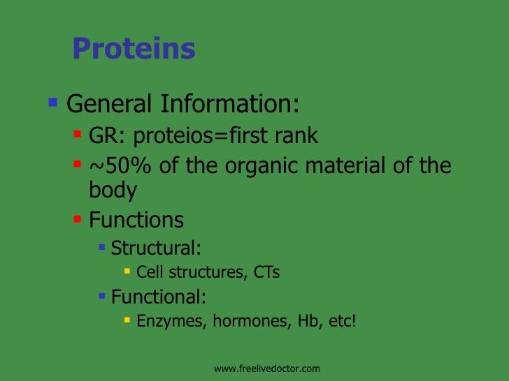 - 68. Proteins General Information: GR: proteios=first rank ~50% of the organic material of the body Functions Structural: Cell structures, CTs Functional: Enzymes, hormones, Hb, etc! www.freelivedoctor.com