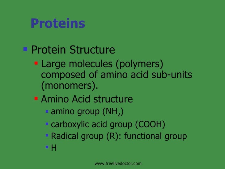 - 69. Proteins Protein Structure Large molecules (polymers) composed of amino acid sub-units (monomers). Amino Acid structure amino group (NH 2 ) carboxylic acid group (COOH) Radical group (R): functional group H www.freelivedoctor.com