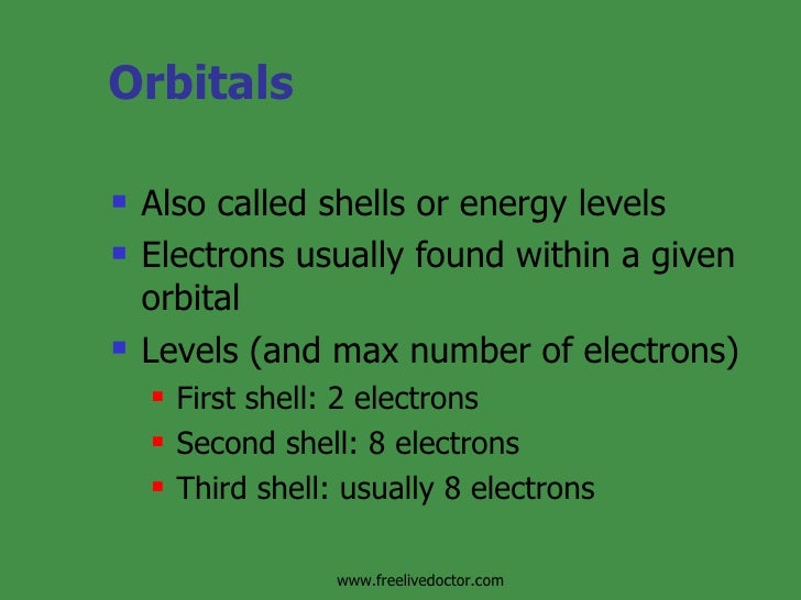 - 7. Orbitals Also called shells or energy levels Electrons usually found within a given orbital Levels (and max number of electrons) First shell: 2 electrons Second shell: 8 electrons Third shell: usually 8 electrons www.freelivedoctor.com