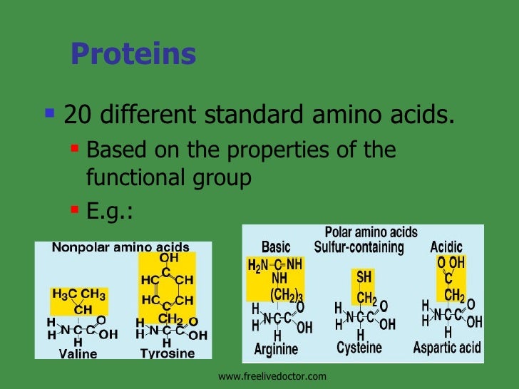 - 71. Proteins 20 different standard amino acids. Based on the properties of the functional group E.g.: www.freelivedoctor.com