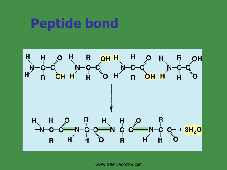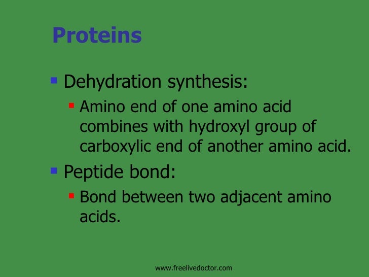 - 72. Proteins Dehydration synthesis: Amino end of one amino acid combines with hydroxyl group of carboxylic end of another amino acid. Peptide bond: Bond between two adjacent amino acids. www.freelivedoctor.com