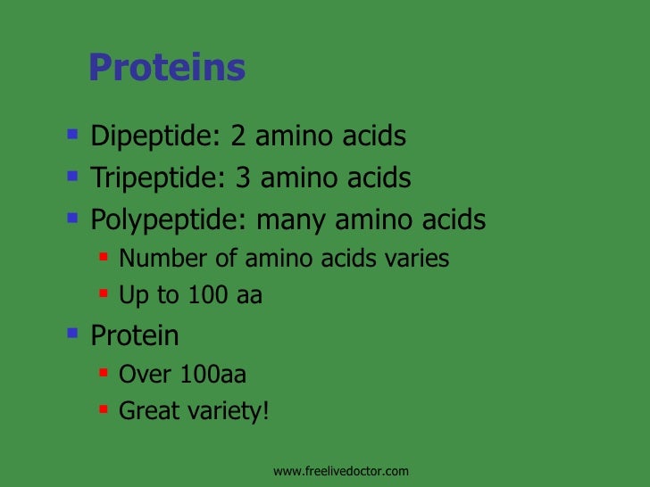 - 74. Proteins Dipeptide: 2 amino acids Tripeptide: 3 amino acids Polypeptide: many amino acids Number of amino acids varies Up to 100 aa Protein Over 100aa Great variety! www.freelivedoctor.com