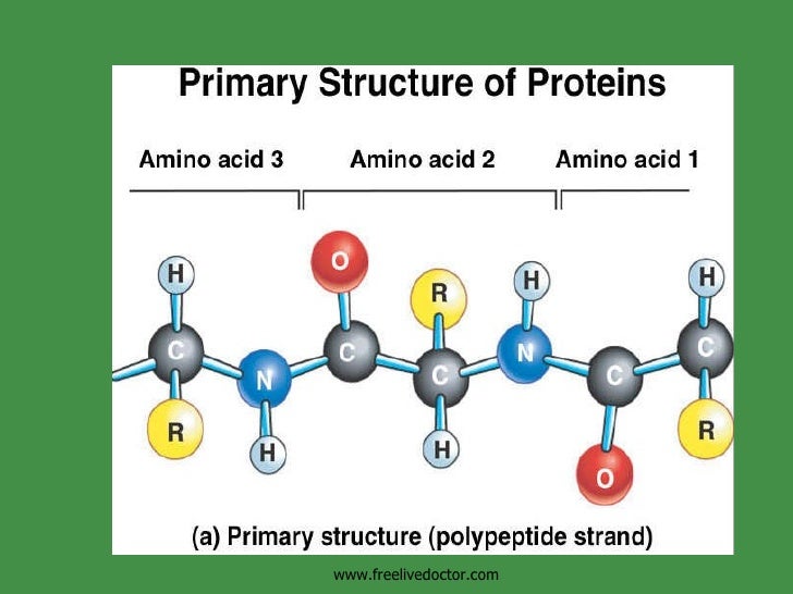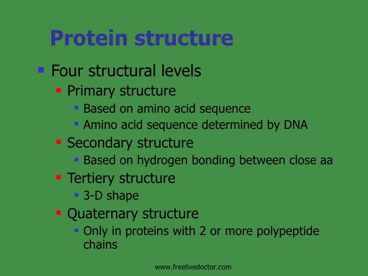 - 75. Protein structure Four structural levels Primary structure Based on amino acid sequence Amino acid sequence determined by DNA Secondary structure Based on hydrogen bonding between close aa Tertiery structure 3-D shape Quaternary structure Only in proteins with 2 or more polypeptide chains www.freelivedoctor.com