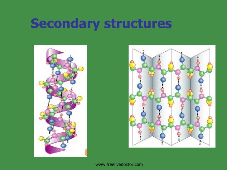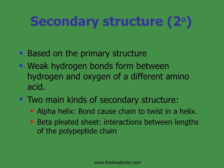 - 77. Secondary structure (2 o ) Based on the primary structure Weak hydrogen bonds form between hydrogen and oxygen of a different amino acid. Two main kinds of secondary structure: Alpha helix: Bond cause chain to twist in a helix. Beta pleated sheet: interactions between lengths of the polypeptide chain www.freelivedoctor.com