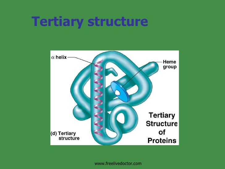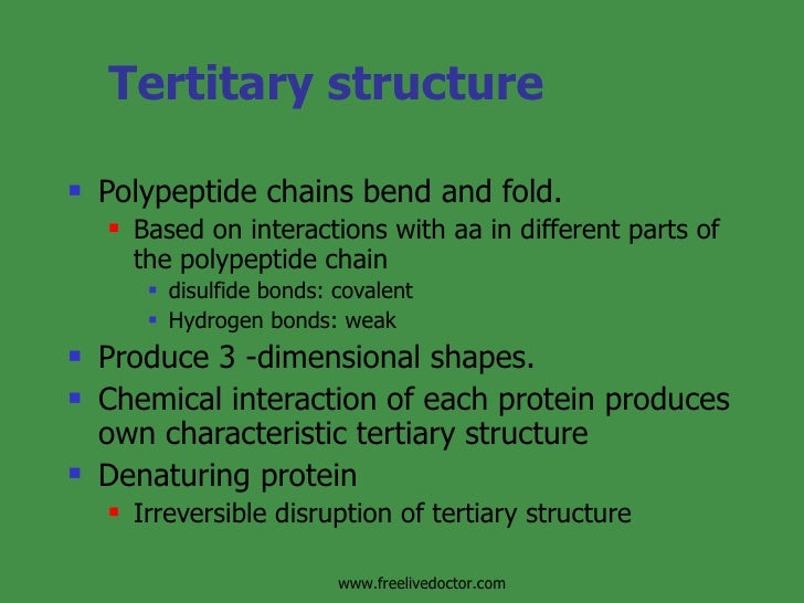 - 79. Tertitary structure Polypeptide chains bend and fold. Based on interactions with aa in different parts of the polypeptide chain disulfide bonds: covalent Hydrogen bonds: weak Produce 3 -dimensional shapes. Chemical interaction of each protein produces own characteristic tertiary structure Denaturing protein Irreversible disruption of tertiary structure www.freelivedoctor.com
