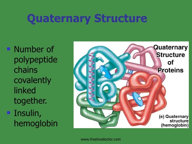 - 82. Quaternary Structure Number of polypeptide chains covalently linked together. Insulin, hemoglobin www.freelivedoctor.com