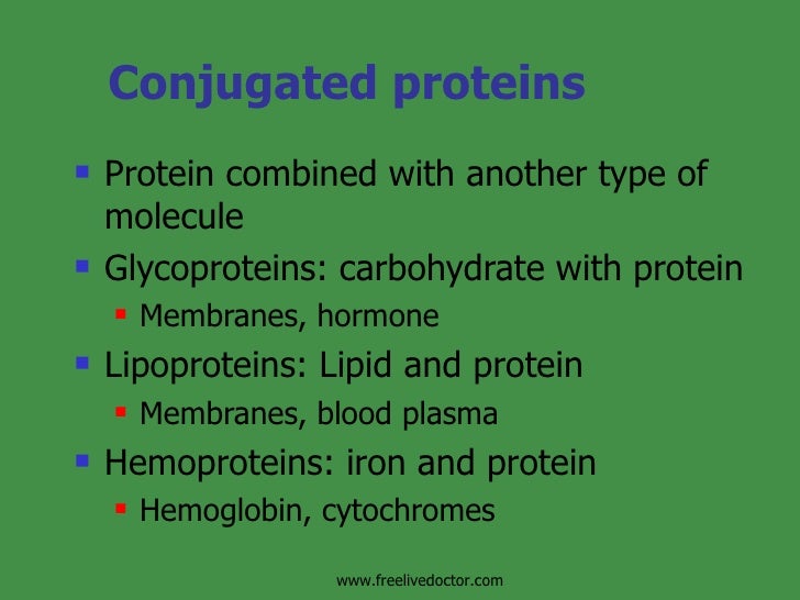 - 83. Conjugated proteins Protein combined with another type of molecule Glycoproteins: carbohydrate with protein Membranes, hormone Lipoproteins: Lipid and protein Membranes, blood plasma Hemoproteins: iron and protein Hemoglobin, cytochromes www.freelivedoctor.com