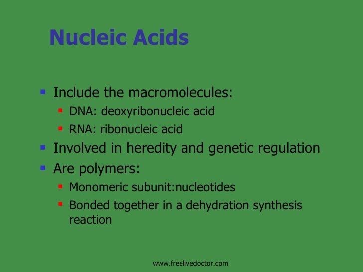- 84. Nucleic Acids Include the macromolecules: DNA: deoxyribonucleic acid RNA: ribonucleic acid Involved in heredity and genetic regulation Are polymers: Monomeric subunit:nucleotides Bonded together in a dehydration synthesis reaction www.freelivedoctor.com
