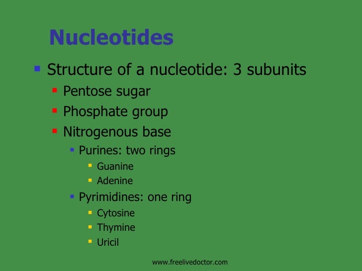 - 86. Nucleotides Structure of a nucleotide: 3 subunits Pentose sugar Phosphate group Nitrogenous base Purines: two rings Guanine Adenine Pyrimidines: one ring Cytosine Thymine Uricil www.freelivedoctor.com