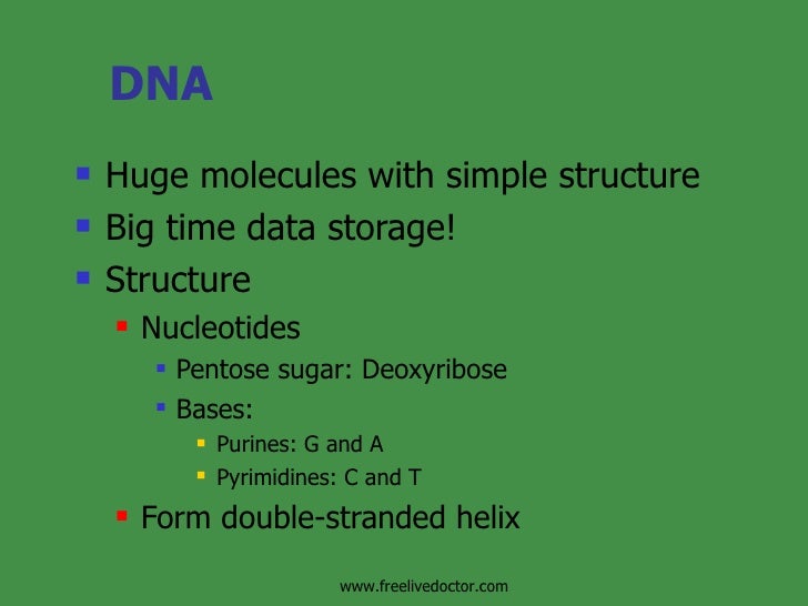 - 89. DNA Huge molecules with simple structure Big time data storage! Structure Nucleotides Pentose sugar: Deoxyribose Bases: Purines: G and A Pyrimidines: C and T Form double-stranded helix www.freelivedoctor.com