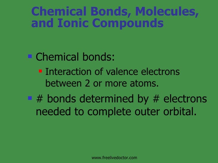 - 9. Chemical Bonds, Molecules, and Ionic Compounds Chemical bonds: Interaction of valence electrons between 2 or more atoms. # bonds determined by # electrons needed to complete outer orbital. www.freelivedoctor.com