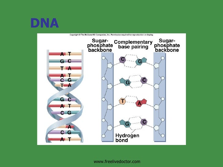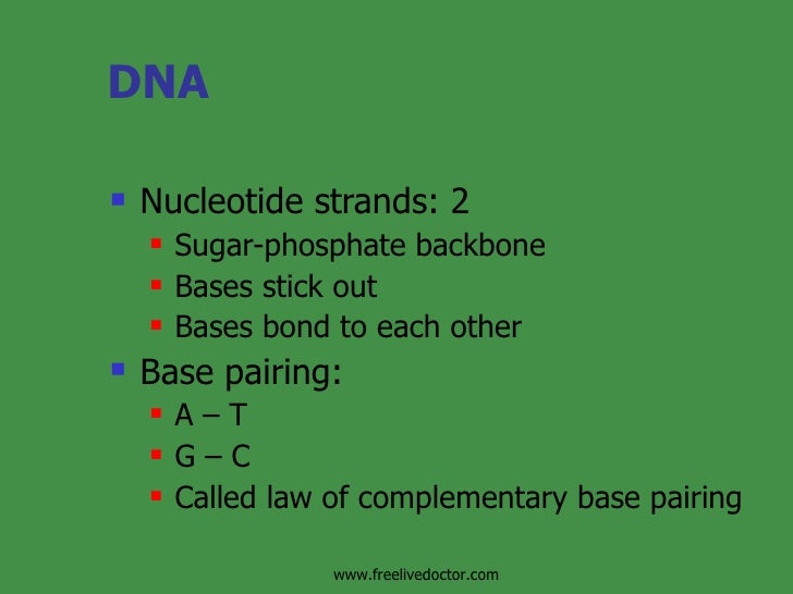 - 90. DNA Nucleotide strands: 2 Sugar-phosphate backbone Bases stick out Bases bond to each other Base pairing: A – T G – C Called law of complementary base pairing www.freelivedoctor.com