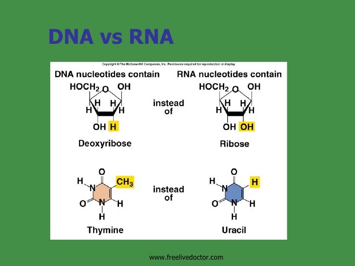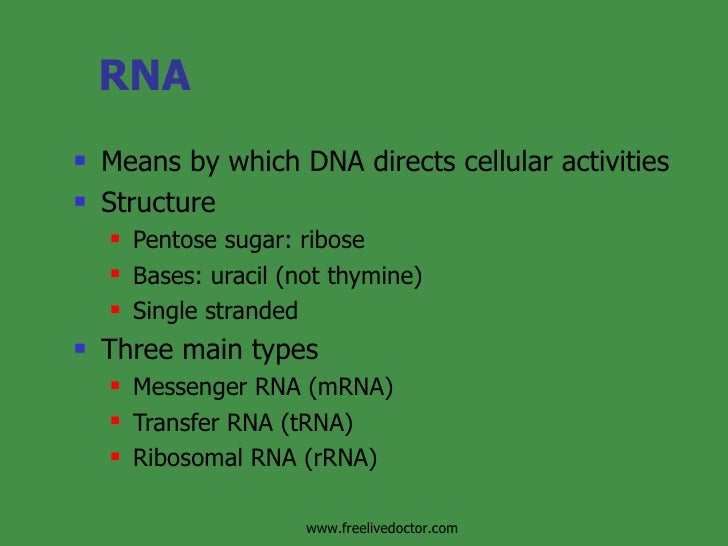 - 93. RNA Means by which DNA directs cellular activities Structure Pentose sugar: ribose Bases: uracil (not thymine) Single stranded Three main types Messenger RNA (mRNA) Transfer RNA (tRNA) Ribosomal RNA (rRNA) www.freelivedoctor.com